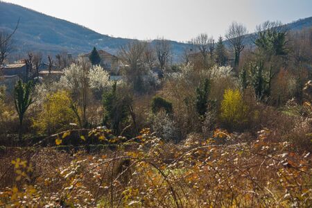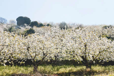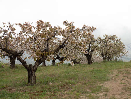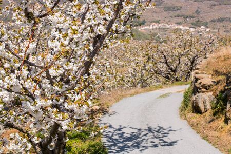 Landscape of fields with cherry trees in flowering time during spring in the town of Alfarnate in Málaga