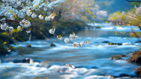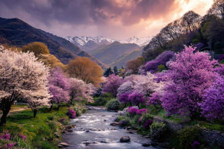 A picturesque view reveals a serene river winding through a valley. Lush green grass and colorful flowering trees flank the water, framed by towering mountains in the distance. The artwork showcases soft lighting, creating a tranquil atmosphere ideal for various commercial projects and editorial applications.