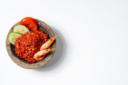 traditional Indonesian chili sauce, fried chili, tomato, onion, and shrimp paste crushed on stone mortar with wooden pestle