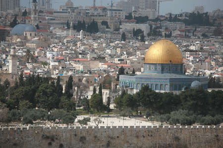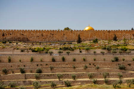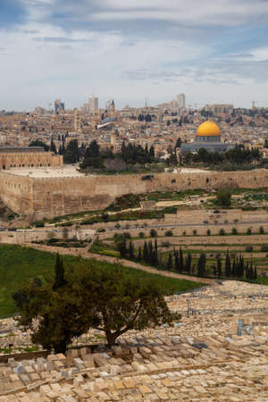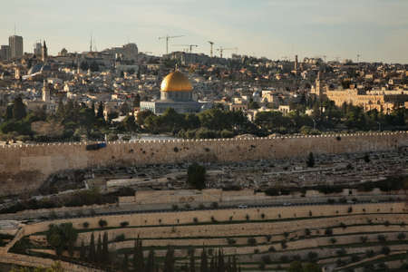Jerusalem old town cityview with the view of the Dome of the Rock mosque and the domes of the church of the holy Sepulchre in the background from the Mount of Olives, Jerusalem, Israel