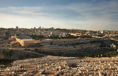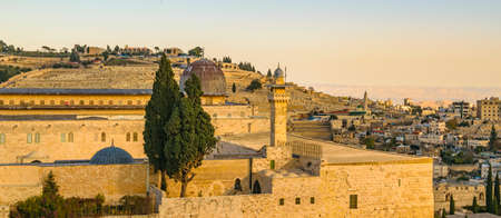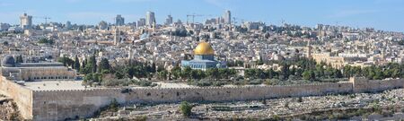 Panorama of the Old City in Jerusalem. View of the Temple Mount from the Mount of Olives.