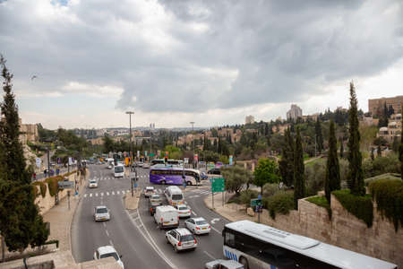 Old City, Jerusalem, Israel - April 2, 2019: Busy streets with cars and traffic near the Old City during a cloudy day.