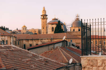 Jerusalem Old City, Christian Quarter. View from the rooftops of Jerusalem on the Christian church. Jerusalem day. Old City of Jerusalem.
