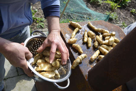 The Jerusalem artichoke harvest. Autumn organic vegetable garden.