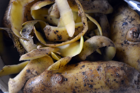 Close up of potato tubers with peel in a metal bowl. Beautiful clean, washed potatoes with peelings and a kitchen knife lying in the bowl in the kitchen.
