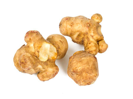 Topinambur root isolated on white background. Also known as Jerusalem artichoke (Helianthus tuberosus). Edible rhizome native to North America with a taste similar to the artichoke.
