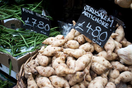 Jerusalem artichokes and fine bean for sale at a farmers market