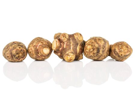 Group of five whole fresh brown jerusalem artichoke in line isolated on white background