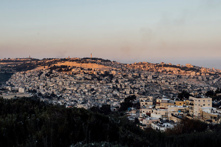Panoramic sunset view of Jerusalem Old City and Temple Mount from the Mount of Olives