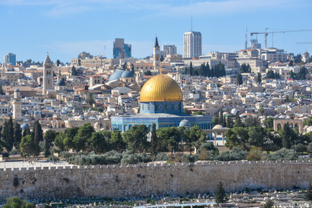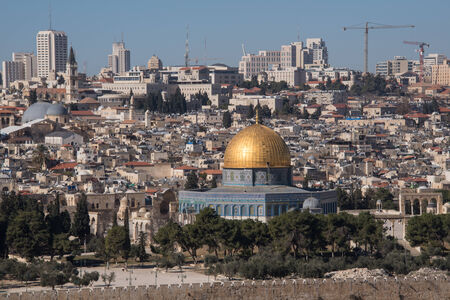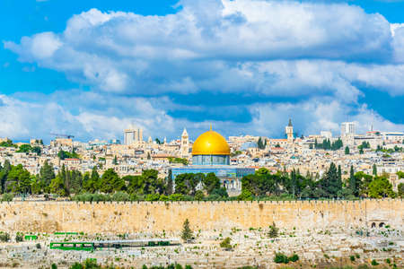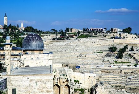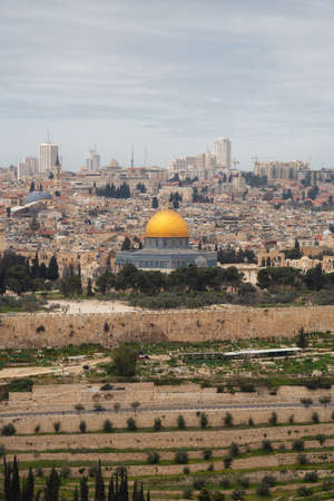 Jerusalem old town cityview with the view of the Dome of the Rock mosque and the domes of the church of the holy Sepulchre in the background from the Mount of Olives, Jerusalem, Israel