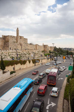 Old City, Jerusalem, Israel - April 2, 2019: Busy streets with cars and traffic near the Old City during a cloudy day.