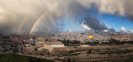 Beautiful panoramic aerial view of the Old City, Tomb of the Prophets and Dome of the Rock. Dramatic Rain and Rainbow Sky Composite. Jerusalem, Capital of Israel.