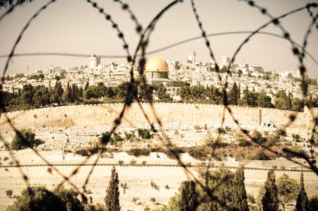View from the Mount of Olives on the dome of the rock and ancient cemetery through the barbed wire, as a symbol of Palestine Israeli conflict. Retro style