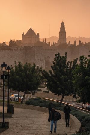 View from top of ancient walls surrounding Old City in Jerusalem. View on the landmarks of Jerusalem Old City at Sunset/