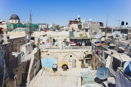 Jerusalem, Israel - October 9, 2018: Rooftop view, with the temple mount and other monuments, in the old city of Jerusalem, Israel.
