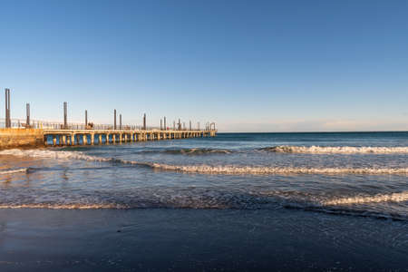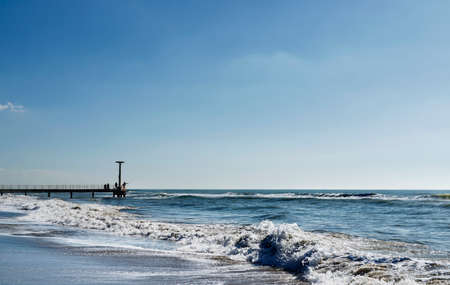 Beach landscape with pier and waves of the sea in the sand (Jesolo, Italy)