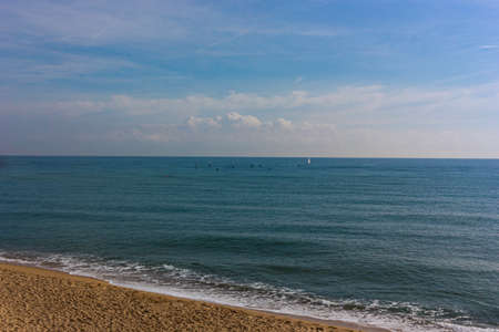 Panoramic landscape photo of beautiful and amazing blue sea and blue sky with clouds.