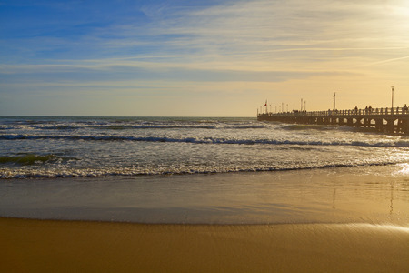 Beach landscape at dawn. Piers perspective view with people. Jesolo beach view, Italian panorama