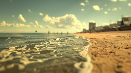 The setting sun casts a warm glow on the sandy beach of bibione, Italy, highlighting the prominent tractor tracks left in the sand