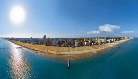 Jesolo city in a aerialial panoramic view on golden beach and blue sea during sunny day and blue sky