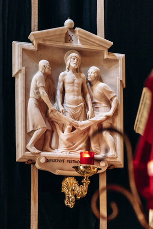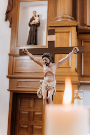 Wooden crucifix with Jesus Christ statue and burning candle in Catholic church interior