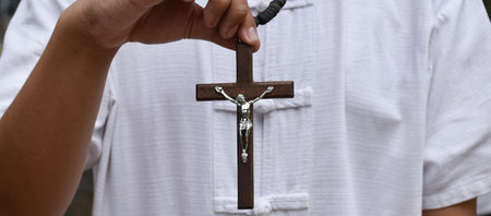 Wooden cross and wooden rosary are held in hands of young asian Catholic prayer while praying in the temple park area.