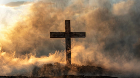 Metallic cross stands prominently against misty morning atmosphere, surrounded by swirling fog and warm golden light, evoking sense of peace and reflection