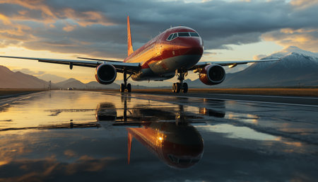 Flying commercial airplane at dusk, reflecting sunset on aircraft wing generated by artificial intelligence
