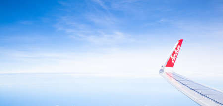 Bangkok, Thailand - June 10, 2019: Air Asia Airline Logo on the wing is seen from passenger window seat view on blue sky and cloud panorama background. Business, Transportation and Travel concept