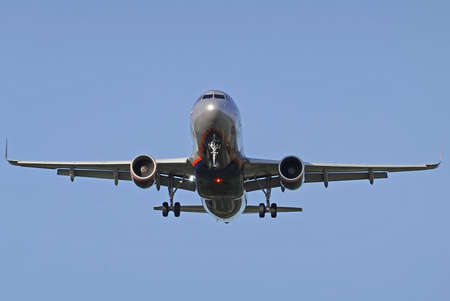 Large airplane preparing the landing with a blue sky
