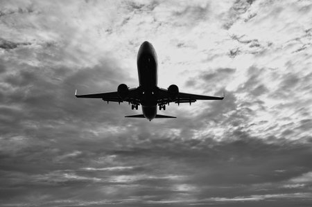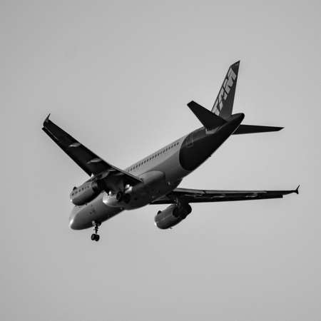 Plane flying in the sky. Black and white photos. Copyspace.