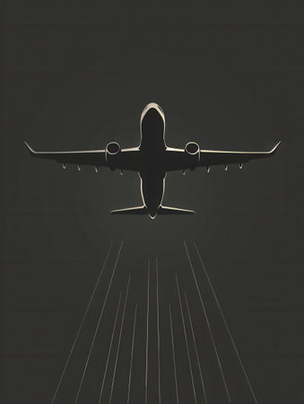 A minimalistic image depicting a sleek airplane silhouette ascending into a dark sky, leaving a trail of condensation.