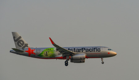 Saigon, Vietnam - Mar 11, 2018. An Airbus A320 aircarft of Jetstar Pacific is landing at Tan Son Nhat Airport (SGN) in Saigon (Ho Chi Minh City), Vietnam.