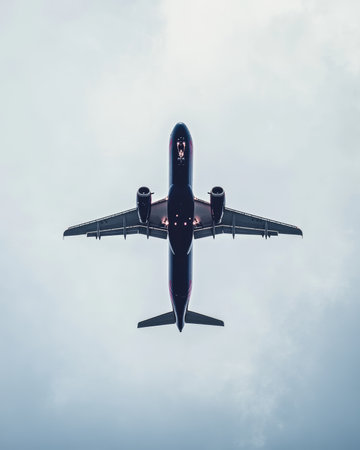 A minimalistic and sleek silhouette of an airplane in flight, soaring through the clouds. Perfect for airlines and flight booking agencies.