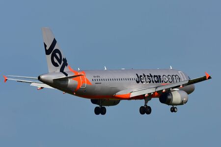 AUCKLAND, NEW ZEALAND - JULY 10: Jetstar Airways Airbus A320 landing at Auckland International Airport on July 10, 2017 in Auckland