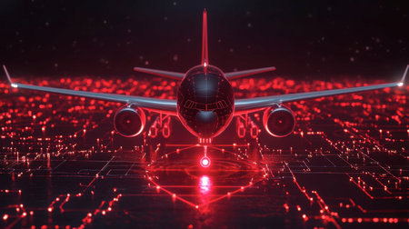 A futuristic aircraft design surrounded by glowing circuitry and neon lights, symbolizing the intersection of technology and aviation in a digital age.