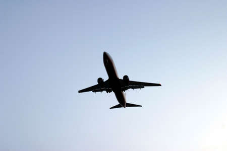 Silhouette of a passenger airplane flying in the blue sky.