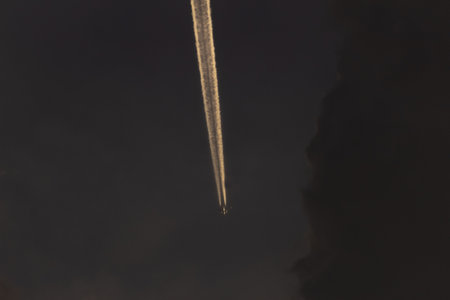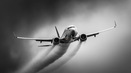 Airplane Flying High in the Sky with Contrails Against a Dark Background, Capturing the Essence of Modern Travel and Aviation in Black and White