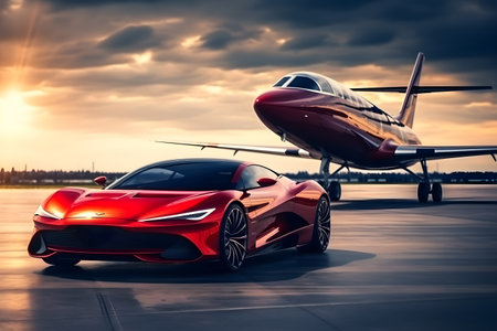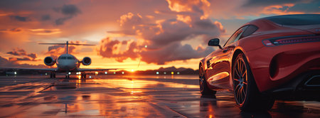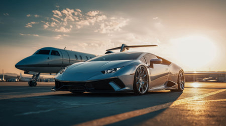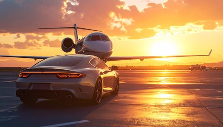 Sleek luxury sports car parked beside private jet on runway during sunset with dramatic lighting
