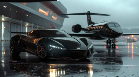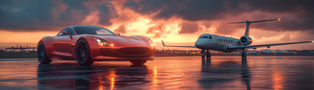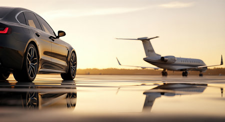 Sleek luxury car and private jet on a runway, sunset reflections on wet pavement, elegant travel