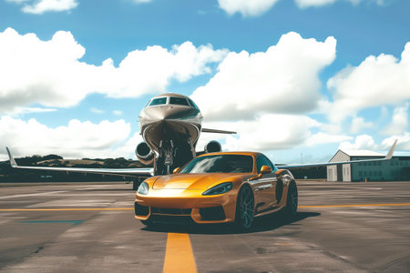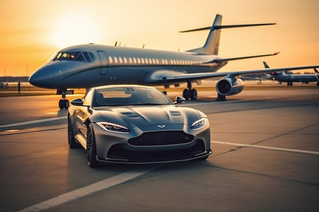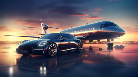 Airplane showing luxury private jet and sports car on airport tarmac at sunset. High resolution image suitable for commercial use.