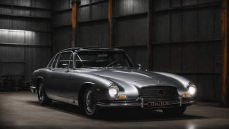 Old-timer luxury racing car in steel monochromatic garage background. Racing, speed, technology and car industry concept. With copy space.