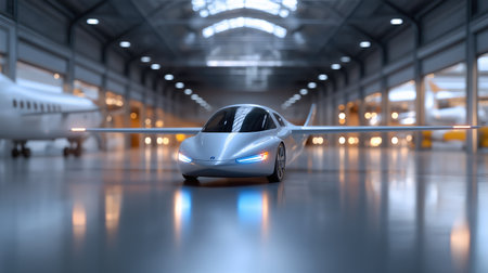 Sleek silver electric aircraft with glowing lights parked in bright hangar suitable for mobility startups aerospace branding and technology editorials