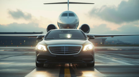Super car and private jet on landing strip. Business class service at the airport. Business class transfer. Airport shuttle