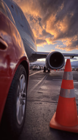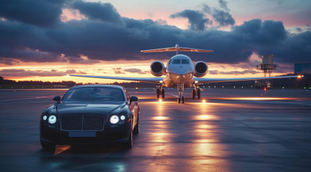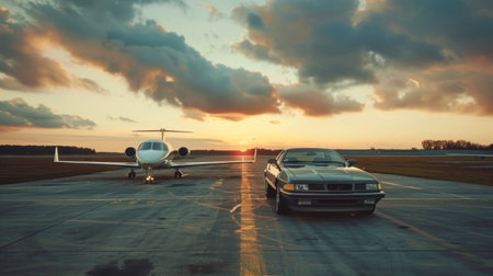 Luxury car and private jet on a runway during a dramatic sunset