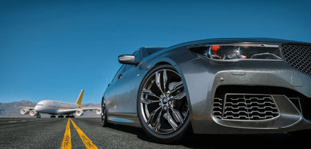 Side view of a luxury sports car and a runway with an airplane behind it, background, sky. 3d render and illustration.