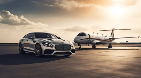 Luxury Car and Private Jet on Landing Strip. Business Travel Generative AI