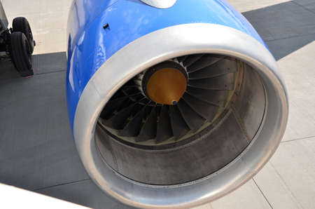 Airplane turbine. Blades propeller. Aircraft jet engine. Close up. Aviation Technologies. Aircraft jet black detail during maintenance. Background.