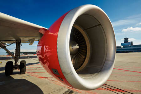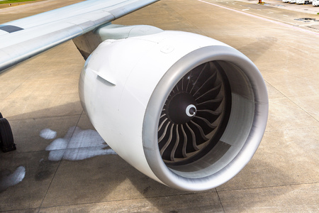 Close up shot of a jet engine of a modern airplane standing on a runway