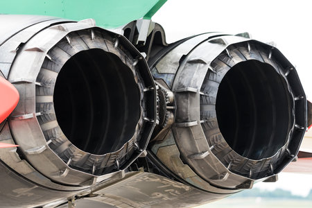 Rear of jet engine of Airbus A-320 commercial airplane with exhaust pipe in the foreground
